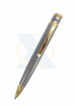Caneta de metal com detalhes dourado e prata.