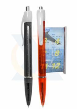 Caneta de plástico transparente, com folhinha de calendário e horóscopo.