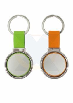 Chaveiro de metal redondo com detalhe colorido em couro sintético.