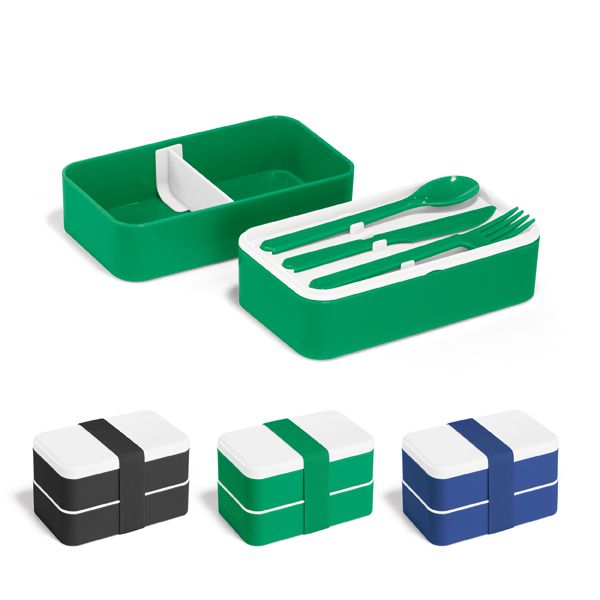 Marmita. PP e PS. Com 2 compartimentos (680 ml cada) e 1 divisória removível. 3 talheres: garfo, faca e colher. Fecha com banda elástica. Apta para microondas (retirar a tampa). Food grade. 180 x 100 x 100 mm personalizada em até 4 cores