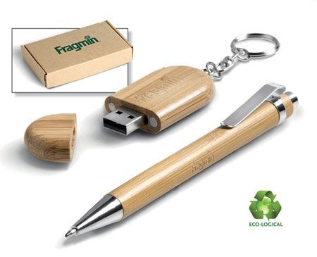 Kit acompanha pen drive de bambu 4 gb caneta de bambu com detalhes de metal, embalagem em papel kraft personalizada.
