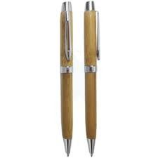 Caneta ecológica de bambu com detalhes de metal.